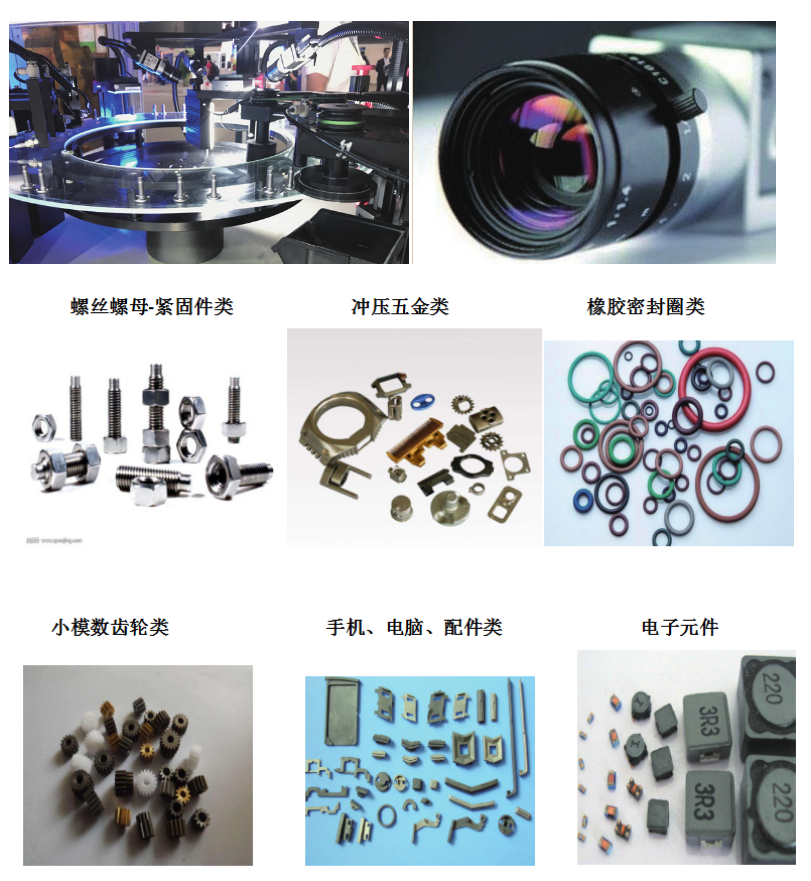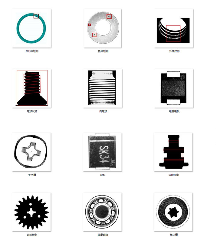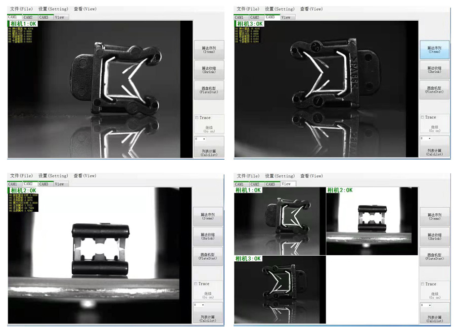 3、 視覺檢測系統:由4套相機及相應光源組成:1#底部相機檢測產品底部投影面尺寸及毛刺;2#側面相機檢測產品側面投影面尺寸及毛刺,3#底部表面相機檢測產品底面倒角尺寸和表面的大裂紋,4#頂部表面相機檢測產品頂面倒角尺寸和表面的大裂紋。